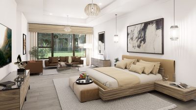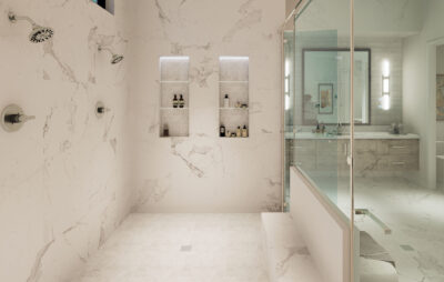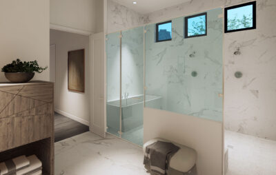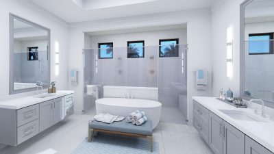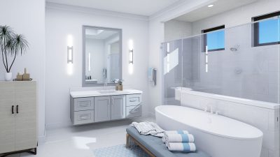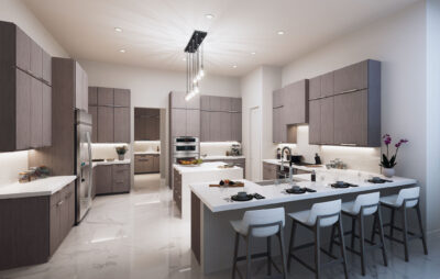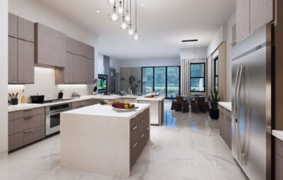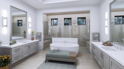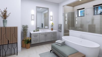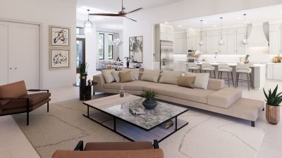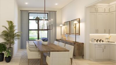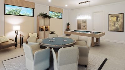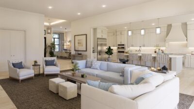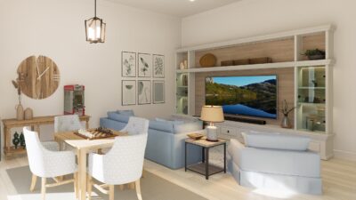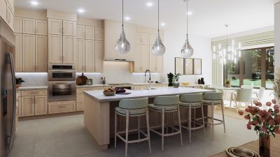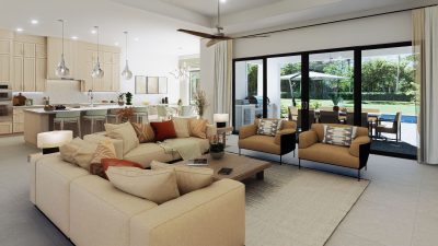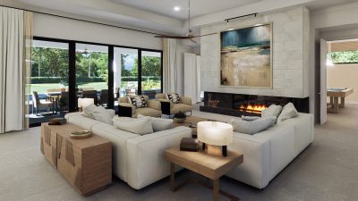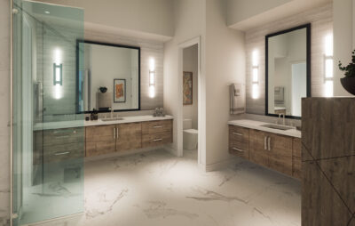 The lavish primary suite includes a sitting area and a spa-inspired bath with a wet room, oversized shower, and freestanding tub. Designer touches abound, with quartz countertops, 48-inch by 48-inch upgraded porcelain tile in the main living areas, and porcelain plank flooring in the bedrooms. Early buyers may have the opportunity to personalize certain interior finishes to make the home truly their own.